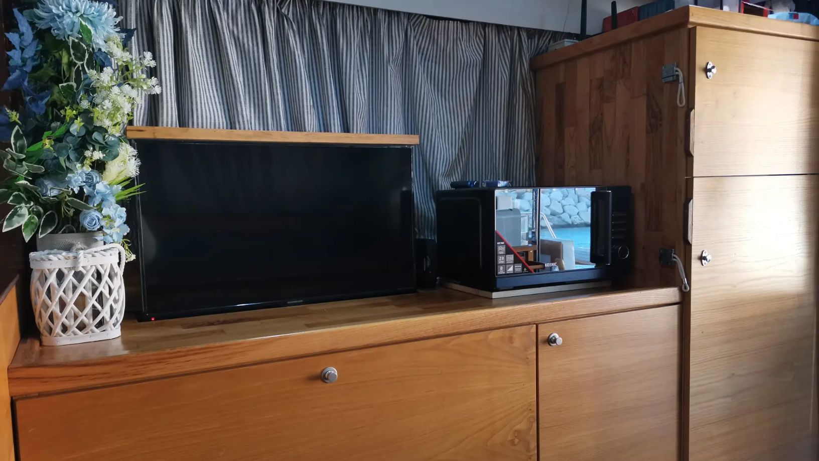 Con servizi di Sky, Netflix, Dazn, ecc, posizionata di fronte alla dinette trasformabile in uno spazioso letto matrimoniale, in grado di accogliere eventualmente anche 3 persone. Accanto un grande frigo ed un microonde per utilizzi comodi e rapidi.