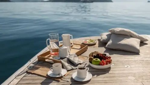 Ami il mare a qualsiasi ora? Ottimo, allora scopri la bellezza di fare la prima colazione in barca, coccolato dal lento ondeggiare del mare al pontile. Inizia bene la tua giornata.